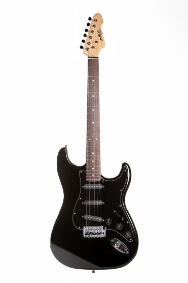 Elektrická kytara typu ST, v černé barvě, high gloss.