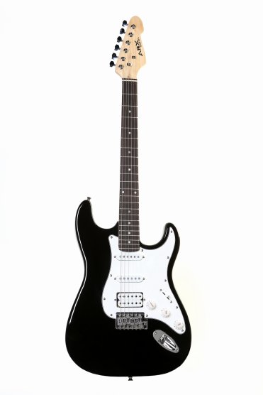 Elektrická kytara typu ST, v černé barvě, high gloss.