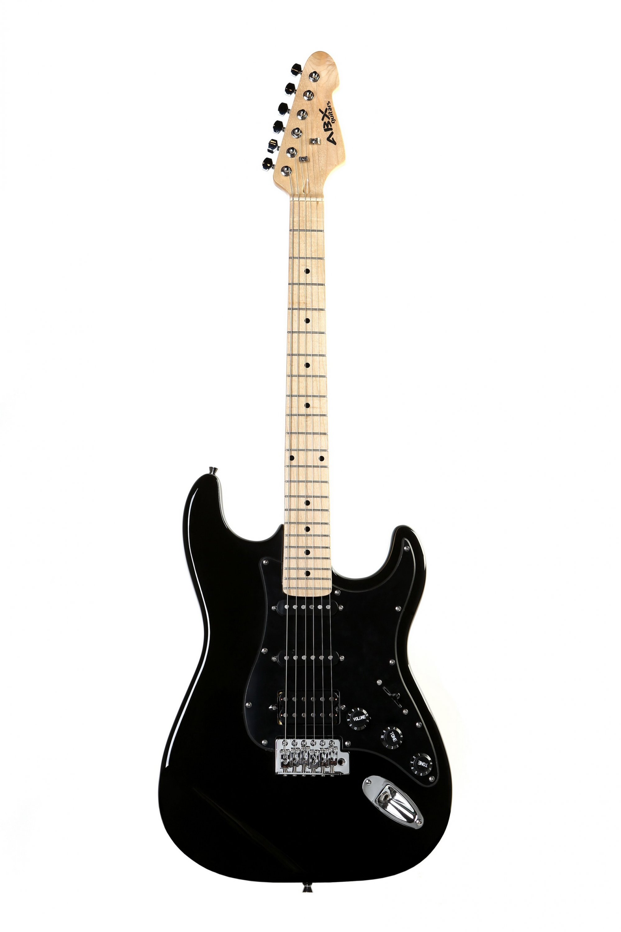 Elektrická kytara typu ST, v černé barvě, high gloss.